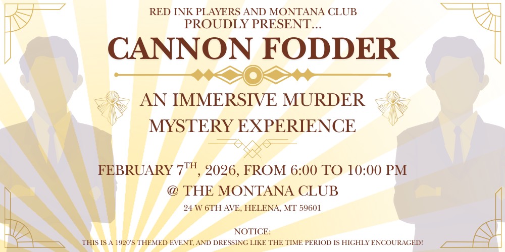 Produced by Red Ink Players and The Montana Club, “Cannon Fodder” is an original immersive murder mystery set in 1925. Attendees will follow the action and have opportunities to interact with actors in order to piece together the story. Dressing up is not required, but is welcomed and encouraged. Vegan and vegetarian options will be available.