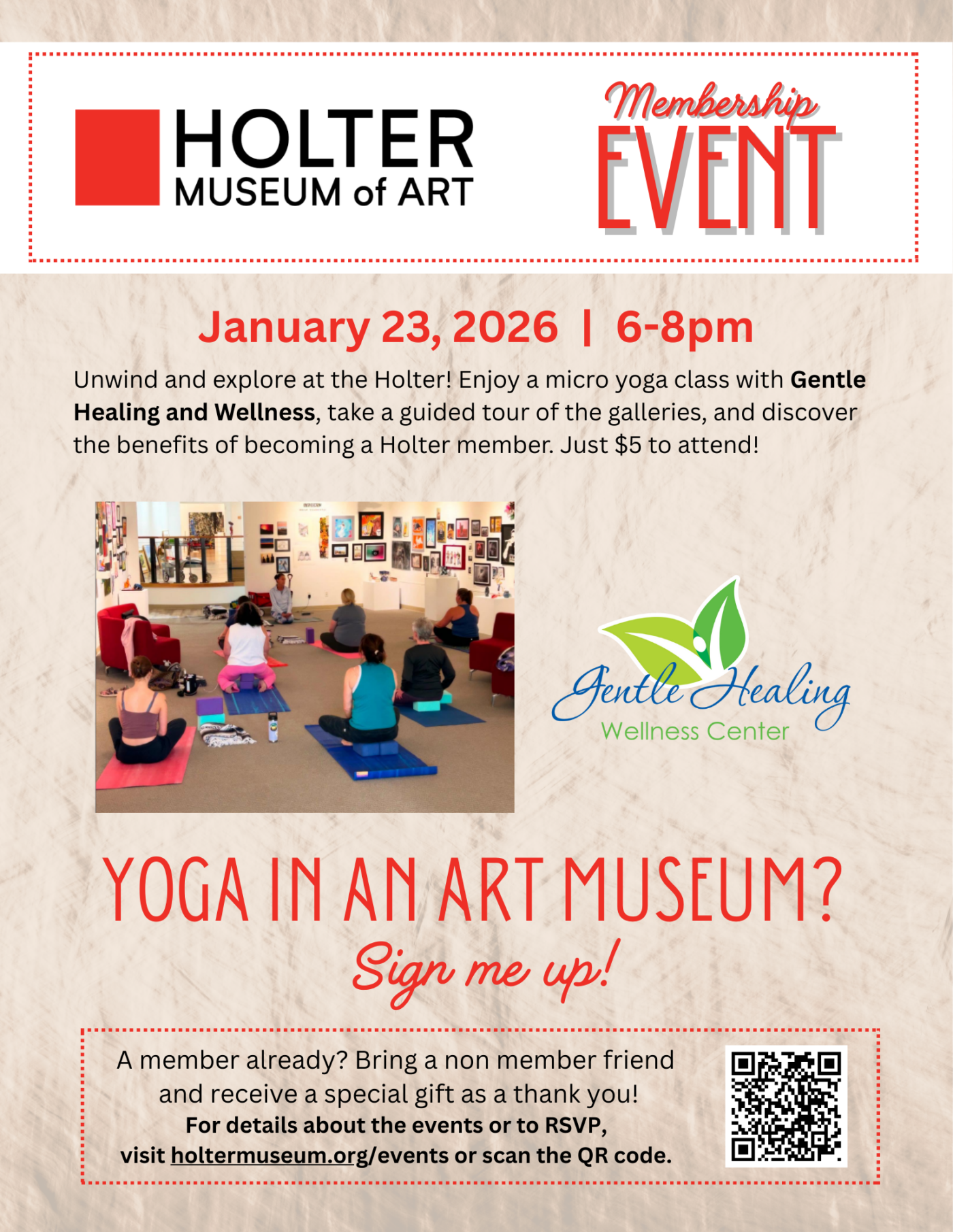 Unwind and explore at the Holter! Enjoy a micro yoga class with Gentle Healing and Wellness, take a guided tour of the galleries, and discover the benefits of becoming a Holter member. Just $5 to attend!
