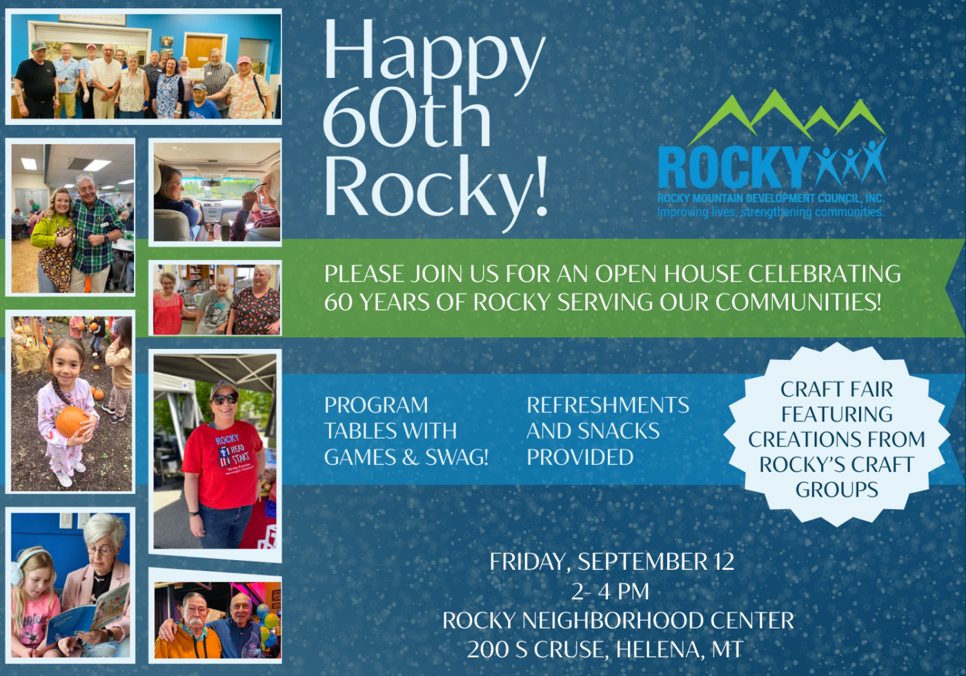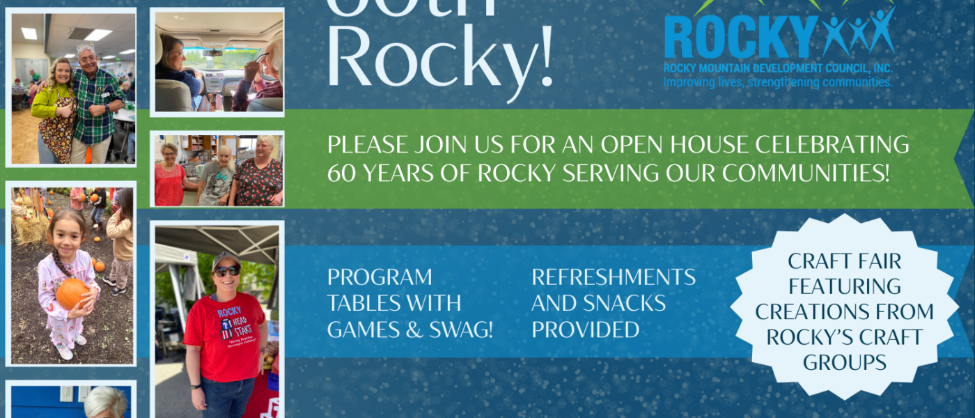 Celebrate 60 years of Rocky Mountain Development Council with an Open House! Meet program directors, explore Rocky’s history, enjoy refreshments, and shop for handmade items from Rocky’s craft groups. Free and open to the public.